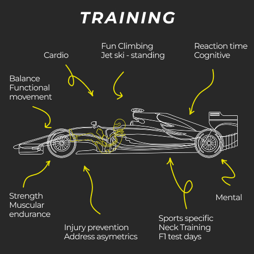 From a performance standpoint, an F1 race can last up to two hours, requiring the driver to sustain a consistently high output throughout. A well-developed aerobic system is therefore critical.