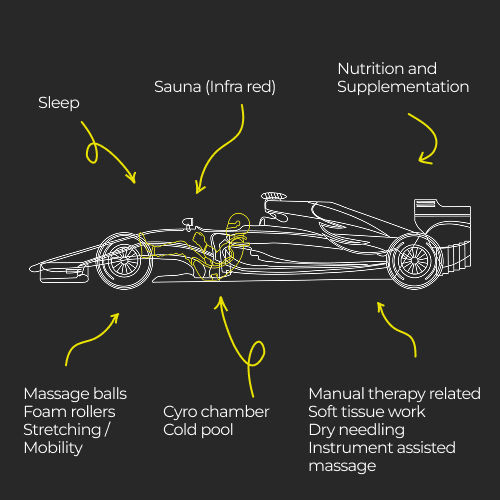Quality targeted nutrition is a big part of the recovery and repair process in combination with all of these other modalities. Supplementation is also used to optimize recovery from driving, training and travel as well as sleep. In the majority of cases I have worked with my biochemist to tailor the supplements to our needs ensuring the highest quality ingredients in doses scienticifally shown to work.